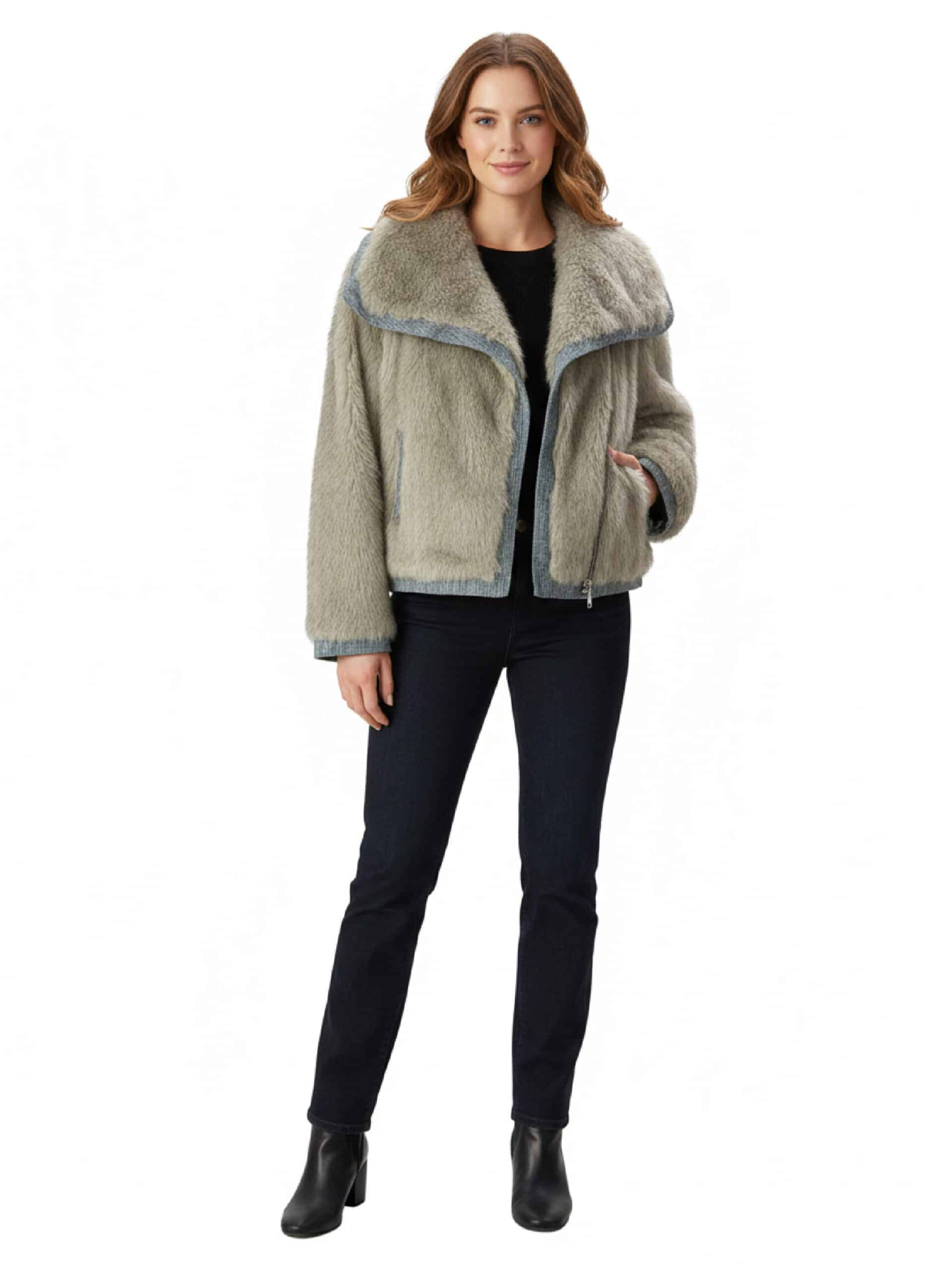 🧥 Abrigo Lisboa es un abrigo de pelo con detalles en tela vaquera, diseñado para combinar calidez y estilo en un solo look.