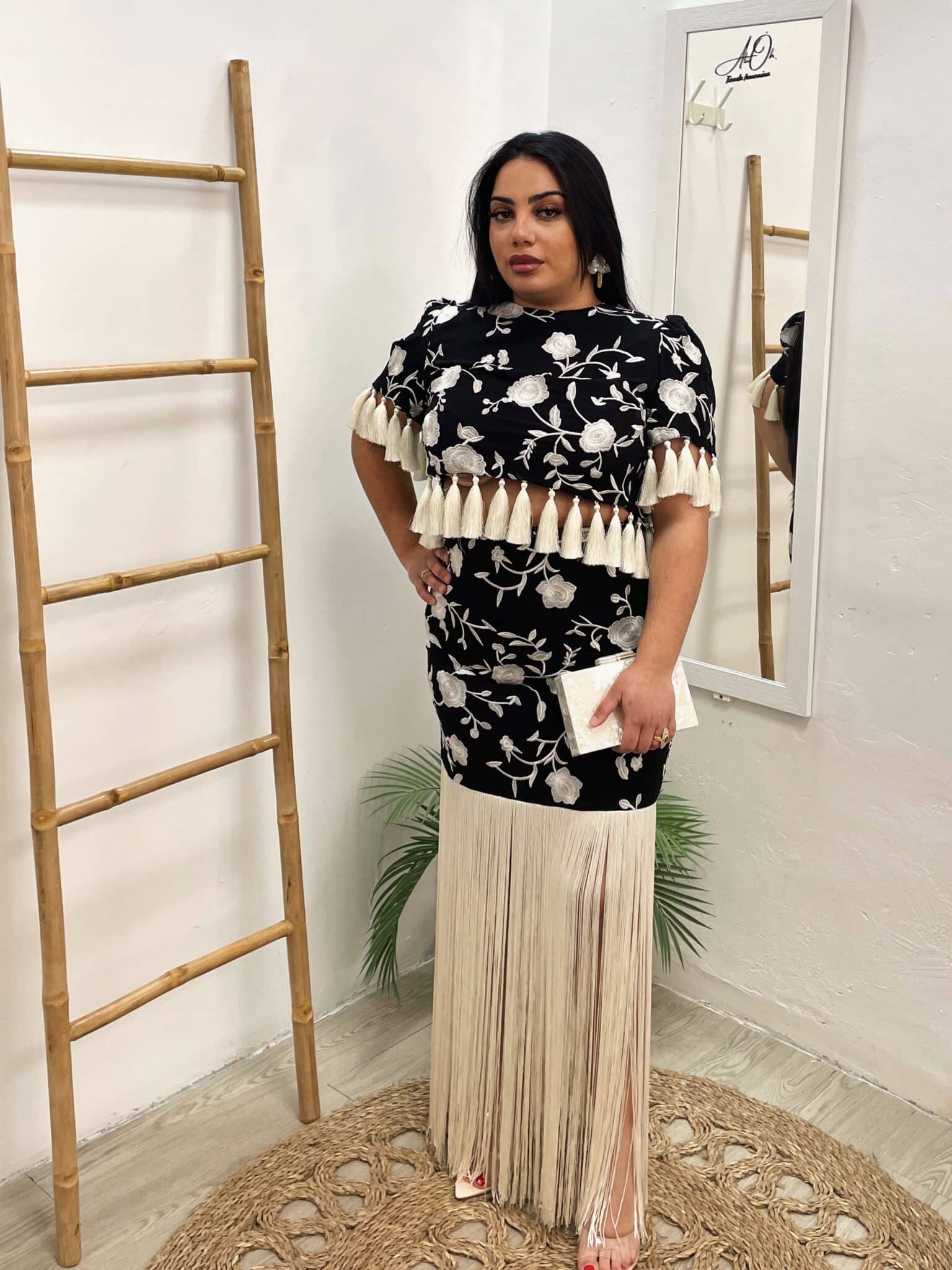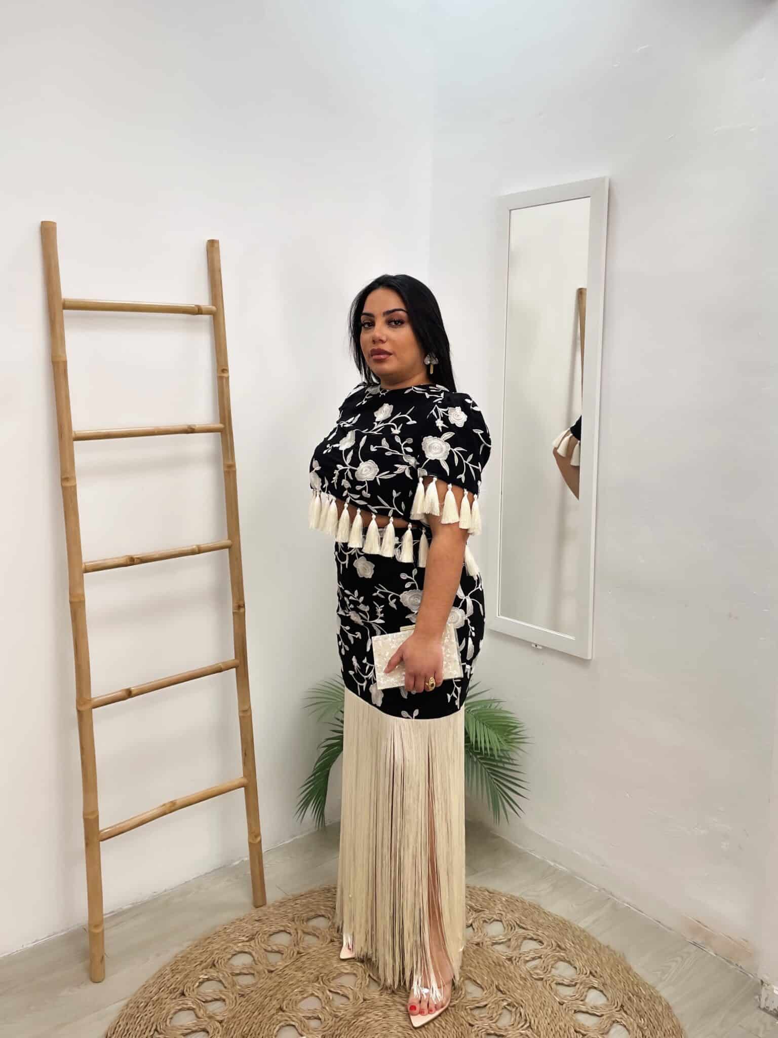 ✨ Conjunto Flecos es un conjunto elegante de top y falda, con flores bordadas y flecos de alta calidad, pensado para un estilo sofisticado y con movimiento.